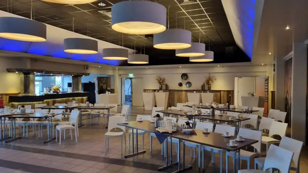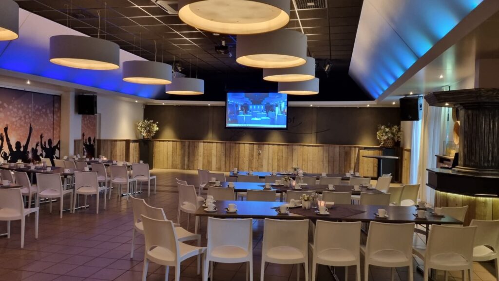 - Alle middelen zoals beamer/scherm,microfoons, podium, flipover, internet en dergelijke zijn aanwezig.
